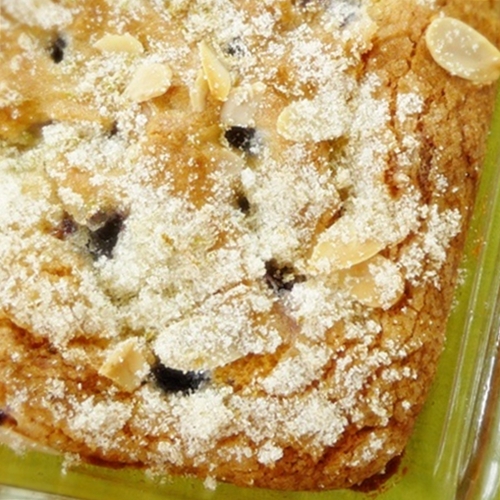 Add flour and milk to butter mixture, starting with flour and ending with flour, mixing well after each addition. Drop in a good heaping tablespoon of almond filling and mix into batter. Fold in blueberries. Spray 9x9 glass baking dish with cooking spray. Spread ½ of batter mix in bottom of pan. Spread remaining almond filling over bottom layer, top with remaining batter. Note: The batter does not spread easily. Be patient and use the back of a large spoon. I will work, I promise, just look at my cake. lol