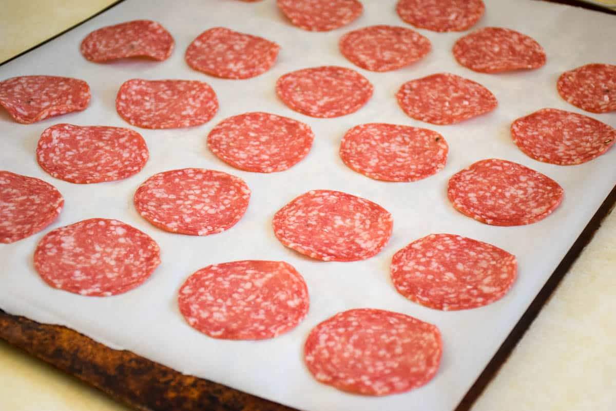 - Place salami slices on prepared baking sheet. Bake for 15-20 minutes, until chips have browned around the edges and become crispy.